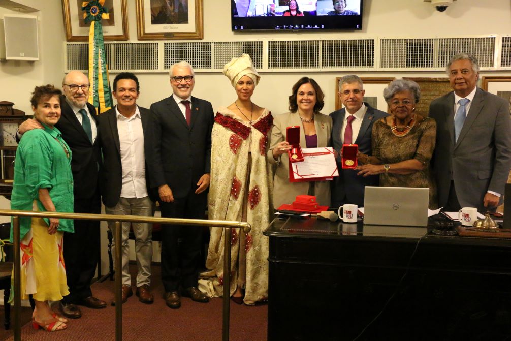 Reconhecimento – O trabalho de Leila Pose à frente da Diretoria Cultural e da Escola Superior do Instituto (ESIAB) também foi celebrado durante a cerimônia. Criadora do selo IAB Cultura e condutora de importantes eventos da entidade, ela recebeu, de surpresa, o Conjunto de Medalhas Esperança Garcia. A comenda é destinada a mulheres que atuam na defesa dos direitos humanos e lutam pela equidade de gênero e raça. Esperança, interpretada por Soraia, fez a entrega da homenagem.