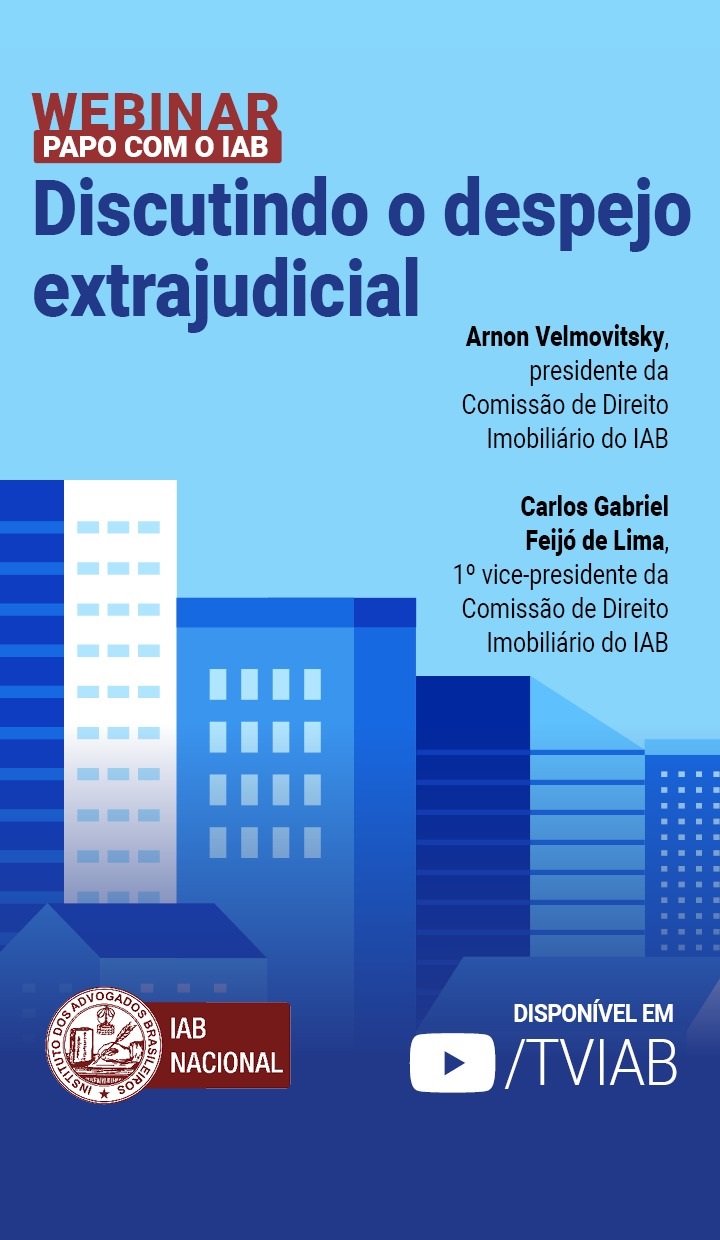 O presidente da Comissão de Direito Imobiliário do Instituto dos Advogados Brasileiros (IAB), Arnon Velmovitsky, e o 1º vice-presidente da comissão, Carlos Gabriel Feijó de Lima, falam sobre o tema ‘Discutindo o despejo extrajudicial’ na próxima webinar Papo com o IAB. A conversa, que foi gravada, estará disponível no canal IABTV no YouTube, a partir desta segunda-feira (4/5).