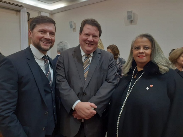 A advogada falou sobre os estudos desenvolvidos pela sua comissão, como também pelas demais comissões temáticas do IAB, “principalmente na gestão da presidente Rita Cortez, marcada pela preocupação constante em acompanhar as mudanças velozes do fato social”. A conferência de abertura do seminário foi feita pelo diretor do escritório da OIT no Brasil, Martin Hahn; “É determinante para o futuro do trabalho o investimento nas pessoas, na empregabilidade e na inclusão social, apoiando a igualdade de gênero e garantindo salários igualitários, condições dignas, crescimento econômico e ambiente propício para empresas sustentáveis”, afirmou. O vice-presidente da Comissão Temporária de Estudos sobre a Agenda 2030/ONU para o Desenvolvimento Sustentável, Célio Pereira Oliveira Neto, também compareceu ao evento. Da esq. para dir., Célio Pereira Oliveira Neto, Martin Hahn e Valéria Tavares de Sant'Anna