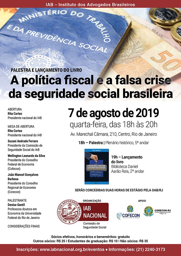 A política fiscal e a falsa crise da seguridade social brasileira. Às 19h, haverá o lançamento da obra na Biblioteca Daniel Aarão Reis, do IAB. As inscrições para o evento, que será aberto pela presidente nacional do IAB, Rita Cortez, podem ser feitas no site