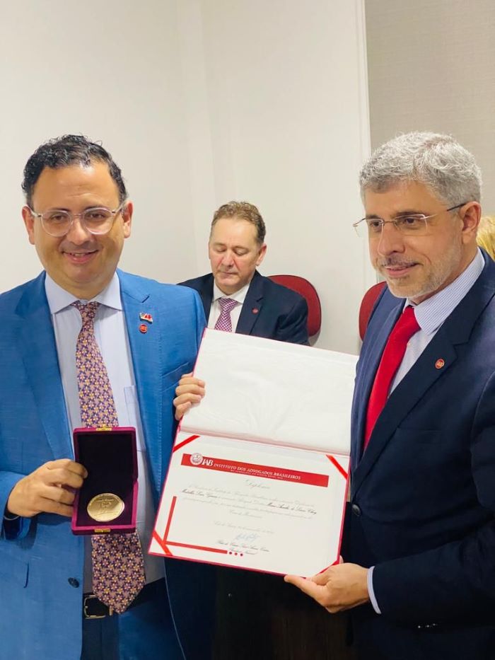 O presidente da OAB/AM foi condecorado por Sydney Sanches. “Nesta gestão, a medalha Luís Gama está à altura da relevância que ela merece; passou a ser concedida intensamente a grandes nomes dedicados à democracia”, disse o 2º vice-presidente do IAB. Com a medalha em mãos, Marco Aurélio Choy lembrou o dia em que conheceu a sede do IAB, no Rio de Janeiro: “Na primeira vez que estive no plenário histórico do IAB, por ocasião da posse de Aniello, fiquei encantado com o espaço e me empolguei em ingressar na Casa de Montezuma”. O novo detentor da Luís Gama também falou: “Estou feliz com a medalha e também por ver o IAB instalado no Amazonas”.