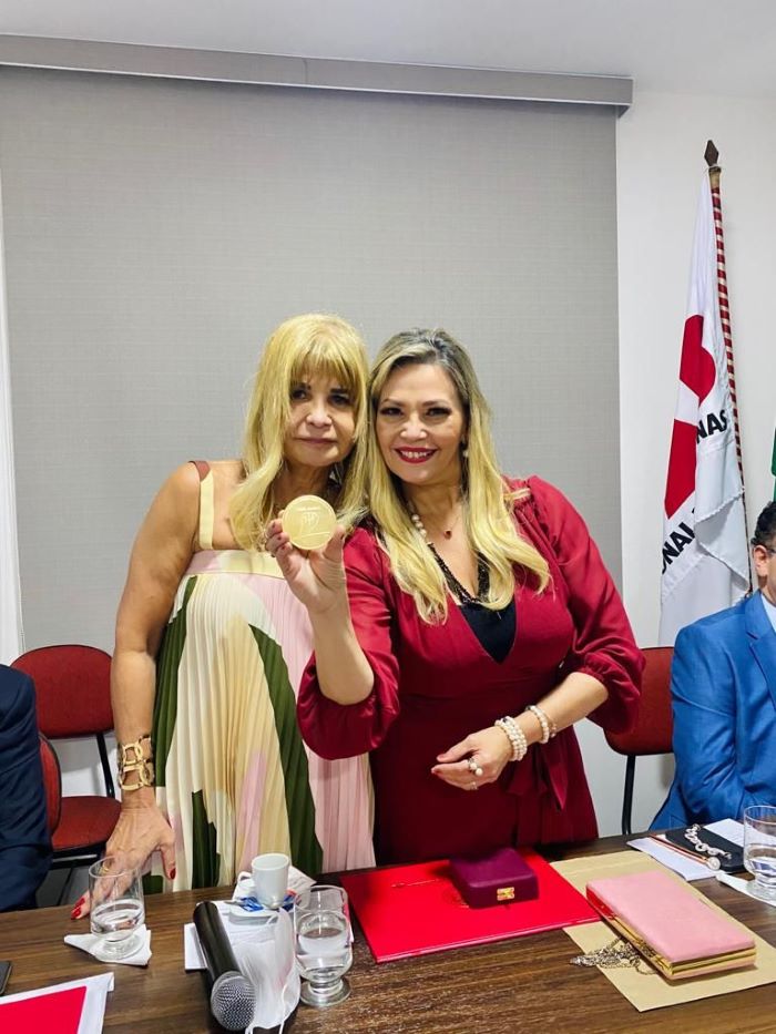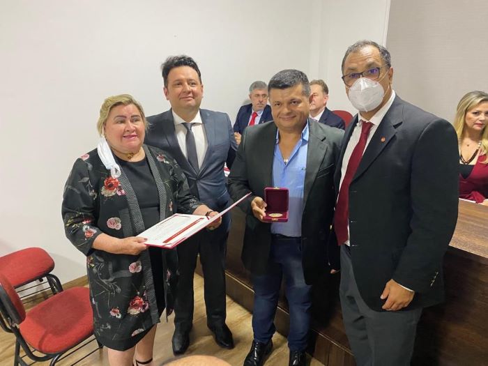 A medalha em homenagem póstuma à procuradora Sandra Maria do Couto e Silva foi entregue por Jorge Folena aos filhos Frederico Barbosa Fortes Junior e Fabricio do Couto Fortes. “Eu a conheci e constatei que ela foi uma grande defensora do Estado do Amazonas, lutando e conseguindo a liberação de recursos que estavam retidos em Brasília e não chegavam até aqui”, relatou Jorge Folena, que acrescentou: “Ela foi também a primeira mulher do Amazonas a ingressar no IAB”. Fabrício falou em nome da família: “Agradecemos pela honrosa homenagem à nossa mãe”. A desembargadora Valdenyra Farias Thomé, do Tribunal Regional do Trabalho do Amazonas (TRT-AM), acompanhava os familiares da homenageada e foi convidada por Aniello Aufiero a se tornar membro honorário do IAB.