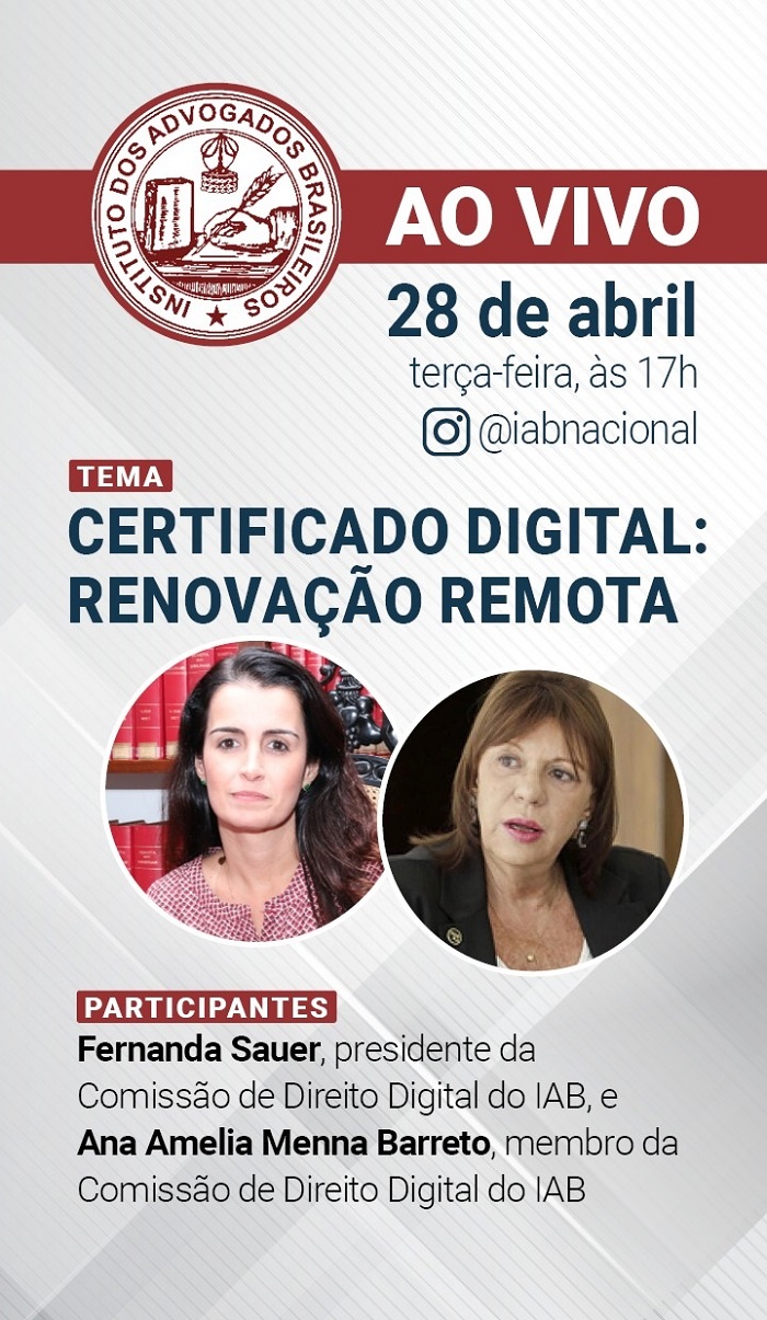 Nem todo mundo sabe que um certificado digital pode ser emitido e renovado a distância, por meio de videoconferência. Por esta razão, o Instituto dos Advogados Brasileiros (IAB) vai realizar uma live no Instagram com o tema ‘Certificado digital: renovação remota’ na próxima terça-feira (28/4), às 17h, no perfil @iabnacional. A presidente da Comissão de Direito Digital do IAB, Fernanda Sauer, vai conversar sobre o assunto com Ana Amelia Menna Barreto, membro da mesma comissão.