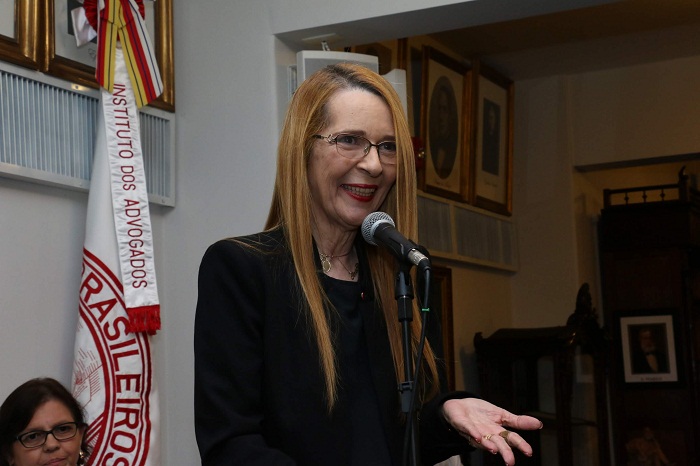 Ana Beatriz Nogueira será membro da Comissão da Mulher. Ela foi indicada pela presidente Rita Cortez e a consócia Luciane Torres Santiago Cardoso, que, ao saudá-la, resumiu: “É uma jurista qualificada e um ser humano exemplar”. A nova consócia falou da sua “grande emoção” por ingressar no IAB. “É como se eu estivesse me formando novamente, 32 anos depois da minha conclusão no curso de Direito”. Ana Beatriz Nogueira fala da tribuna, observada por Luciane Torres Santiago Cardoso