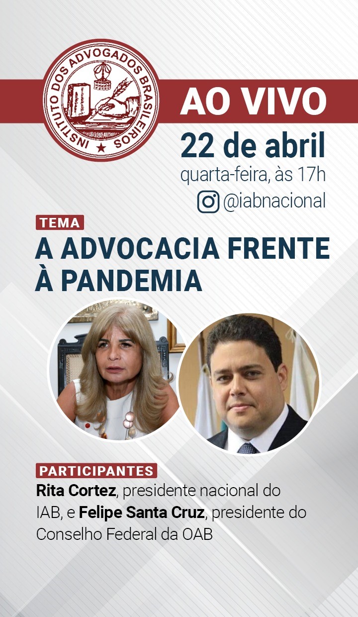 O presidente do Conselho Federal da Ordem dos Advogados do Brasil (CFOAB), Felipe Santa Cruz, é o convidado da live no Instagram que a presidente nacional do Instituto dos Advogados Brasileiros (IAB), Rita Cortez, fará nesta quarta-feira (22/4), às 17h, no perfil @iabnacional. Eles vão conversar sobre 'A advocacia frente à pandemia'.