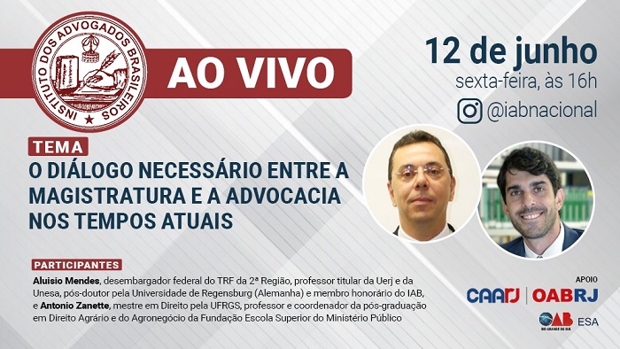 Descrição da imagem: fundo cinza com a logo do Instituto dos Advogados Brasileiros (IAB) em vermelho e branco no canto esquerdo superior. No meio do card há fotos dos rostos dos participantes dentro de dois pequenos círculos.12/6 – (sexta-feira) – 16h – Instagram @iabnacional