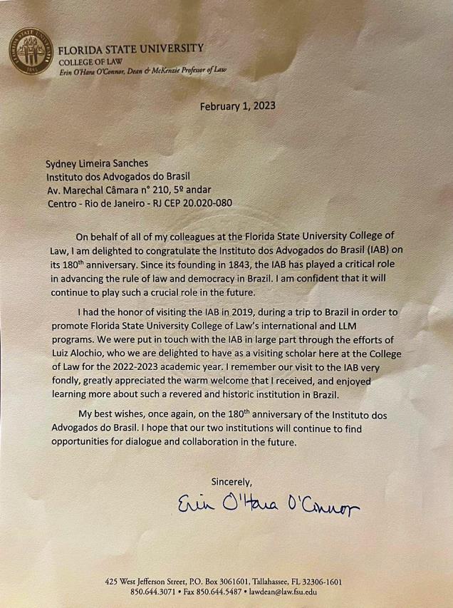 Tive a honra de visitar o IAB em 2019, durante uma viagem ao Brasil para promover os programas internacionais e LLM da Faculdade de Direito da Florida State University. Entramos em contato com o IAB em grande parte graças aos esforços de Luiz Alochio, que temos o prazer de ter como professor visitante aqui na Faculdade de Direito para o ano letivo de 2022-2023. Lembro-me com muita emoção de nossa visita ao IAB, apreciei muito a recepção calorosa que recebi e gostei de saber mais sobre uma instituição tão reverenciada e histórica no Brasil.