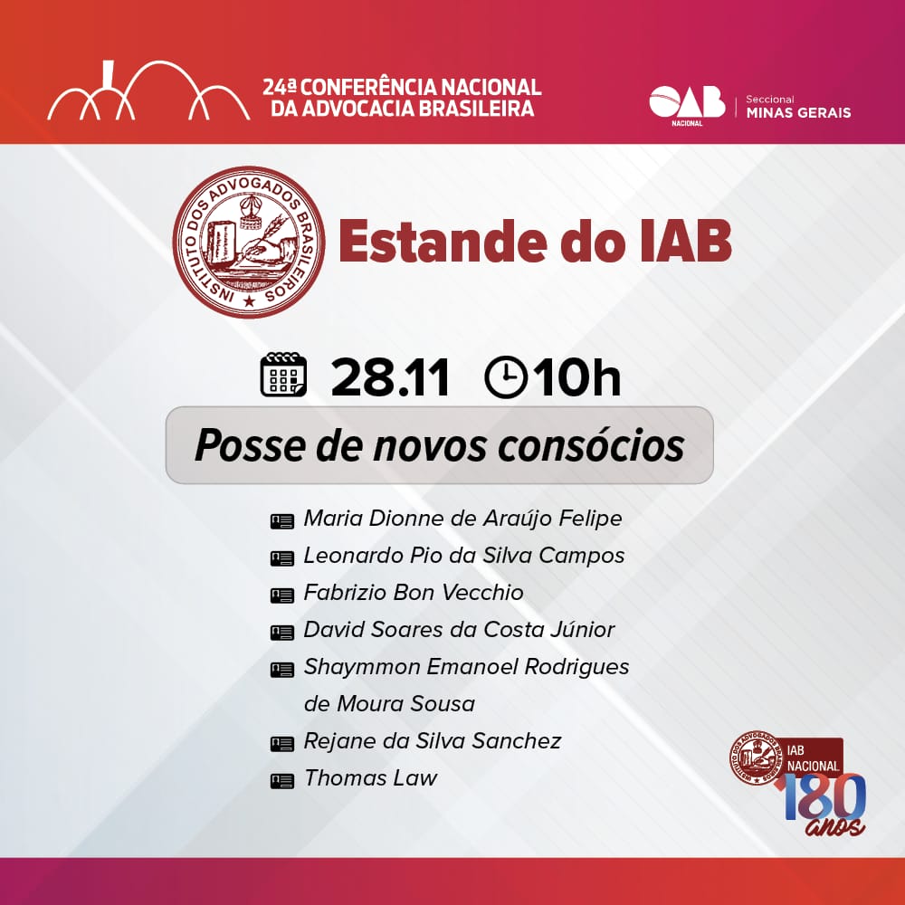 No segundo dia de evento (28/11), às 10h, será a vez das advogadas Maria Dionne de Araújo Felipe e Rejane da Silva Sanchez e os advogados Leonardo Pio da Silva Campos, Fabrizio Bon Vecchio, David Soares da Costa Júnior, Shaymmon Emanoel Rodrigues de Moura Sousa e Thomas Law se unirem aos quadros do Instituto.