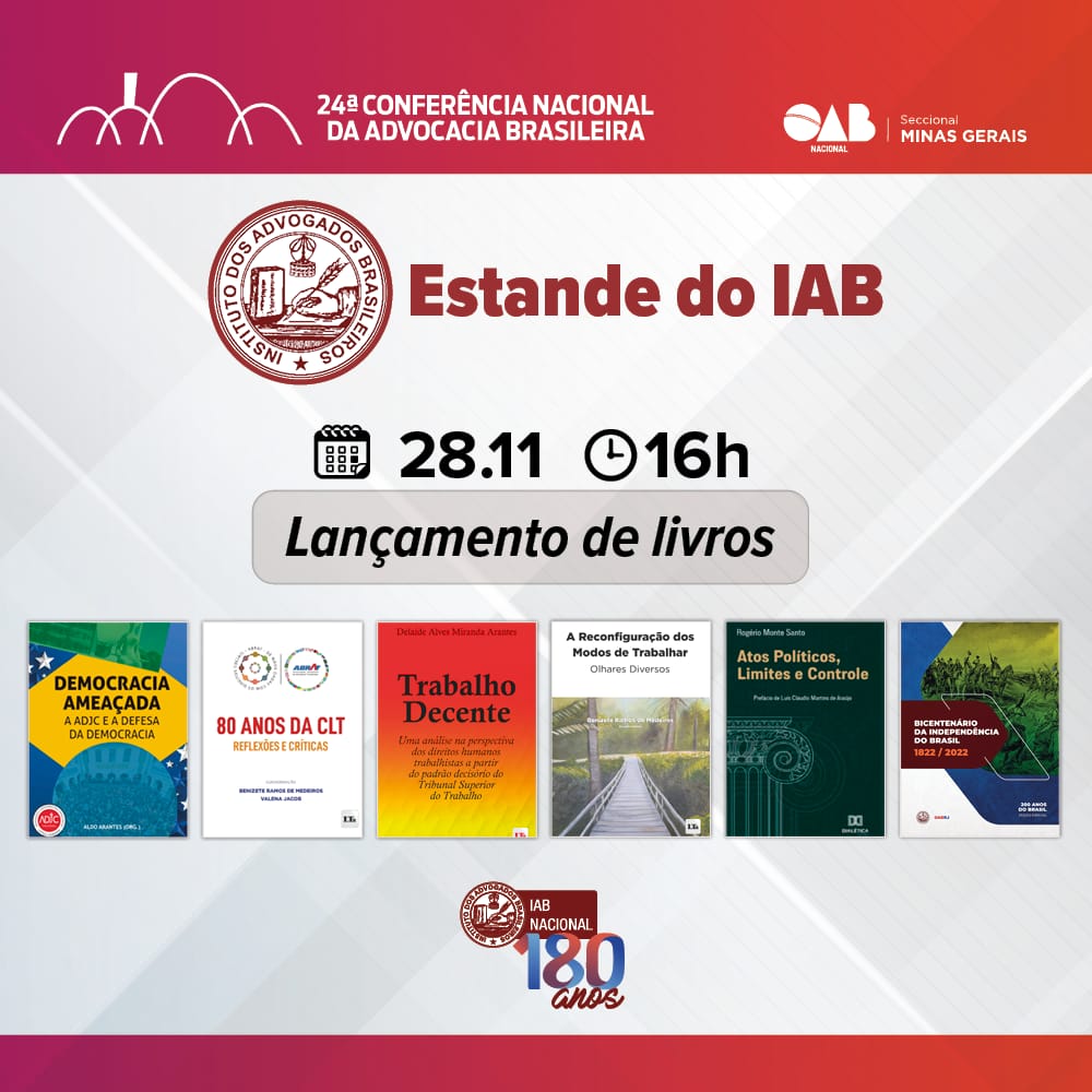 Ainda na terça-feira, a partir das 16h, será realizado o lançamento de seis obras jurídicas produzidas por membros do Instituto, são elas: Democracia ameaçada: A ADJC e a defesa da democracia, organizada por Aldo Arantes; 80 anos da CLT: Reflexões e críticas, coordenada por Benizete Ramos de Medeiros e Valena Jacob; Trabalho decente, de Delaíde Alves Miranda Arantes; A reconfiguração dos modos de trabalhar: Olhares diversos, coordenada por Benizete Ramos de Medeiros; Atos políticos, limites e controle, de Rogério Monte Santo; e a revista Bicentenário da Independência do Brasil 1822-2022, organizada por Kátia Tavares.