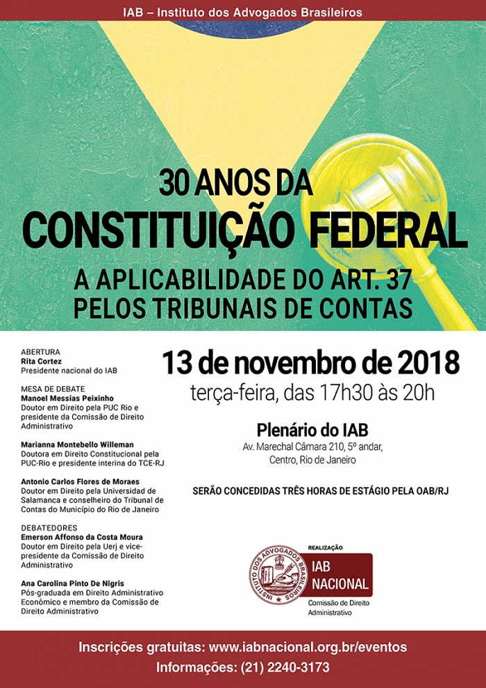 O evento será aberto pela presidente nacional do IAB, Rita Cortez. Participarão dos debates o presidente da Comissão de Direito Administrativo do IAB, Manoel Messias Peixinho; a presidente interina do Tribunal de Contas do Estado do Rio de Janeiro (TCE-RJ), conselheira Marianna Montebello Willeman; o conselheiro do Tribunal de Contas do Município do Rio de Janeiro (TCMRJ) Antonio Carlos Flores de Moraes e os membros da Comissão de Direito Administrativo do IAB Emerson Affonso da Costa Moura e Ana Carolina Pinto De Nigris.
