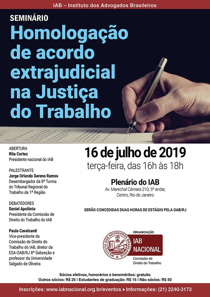 Homologação de acordo extrajudicial na Justiça do Trabalho, no dia 16 de julho, das 16h às 18h, no seu plenário, no Centro do Rio. Organizado pela Comissão de Direito do Trabalho, presidida por Daniel Apolônio Vieira, o evento será aberto pela presidente nacional do IAB, Rita Cortez. As inscrições podem ser feitas no site