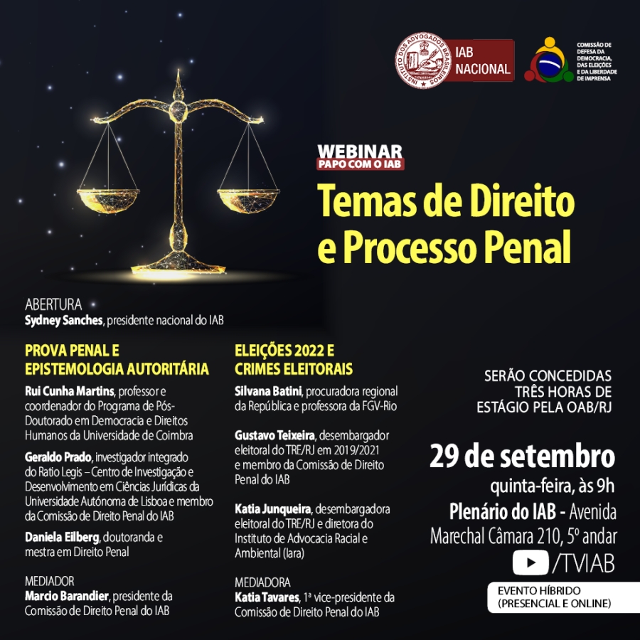 A abertura do evento ficará a cargo do 1º vice-presidente do IAB, Carlos Eduardo Machado. Os temas das mesas de debates serão: Prova penal e epistemiologia autoritária e Eleições 2022 e crimes eleitorais. As palestras serão transmitidas pelo canal TVIAB no YouTube. Os estudantes de Direito que assistirem ao evento receberão três horas de estágio pela OAB/RJ.