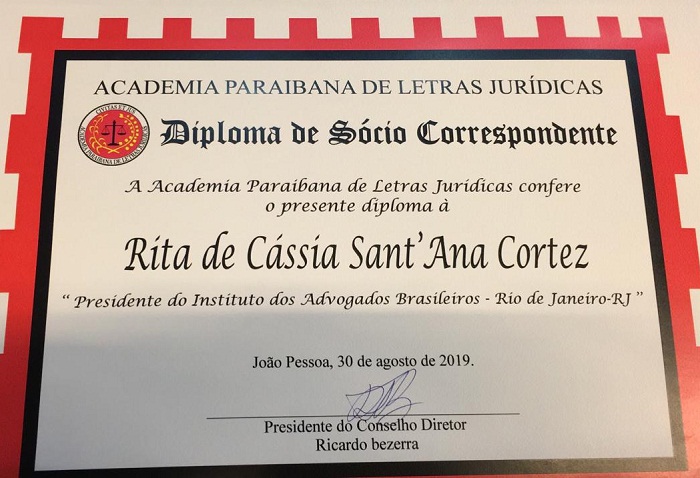 A Academia Paraibana de Letras Jurídicas (APLJ), presidida por Ricardo Bezerra, na comemoração dos seus 42 anos de existência, prestou homenagens ao Instituto dos Advogados Brasileiros (IAB) e à presidente nacional, Rita Cortez, em duas solenidades realizadas na última sexta-feira (30/8), em João Pessoa (PB). Representante institucional titular do IAB na Paraíba e membro da APLJ, o advogado Carlos Pessoa de Aquino recebeu no Centro Cultural Ariano Suassuna, do Tribunal de Contas do Estado (TCE/PB), as comendas Afonso Pereira e Jus Romanum, com as quais a APLJ agraciou o Instituto pelos seus 176 anos. Foi entregue também a Carlos Aquino, na sessão especial promovida na Assembleia Legislativa do Estado da Paraíba, o diploma de Sócio Correspondente concedido à presidente do IAB.