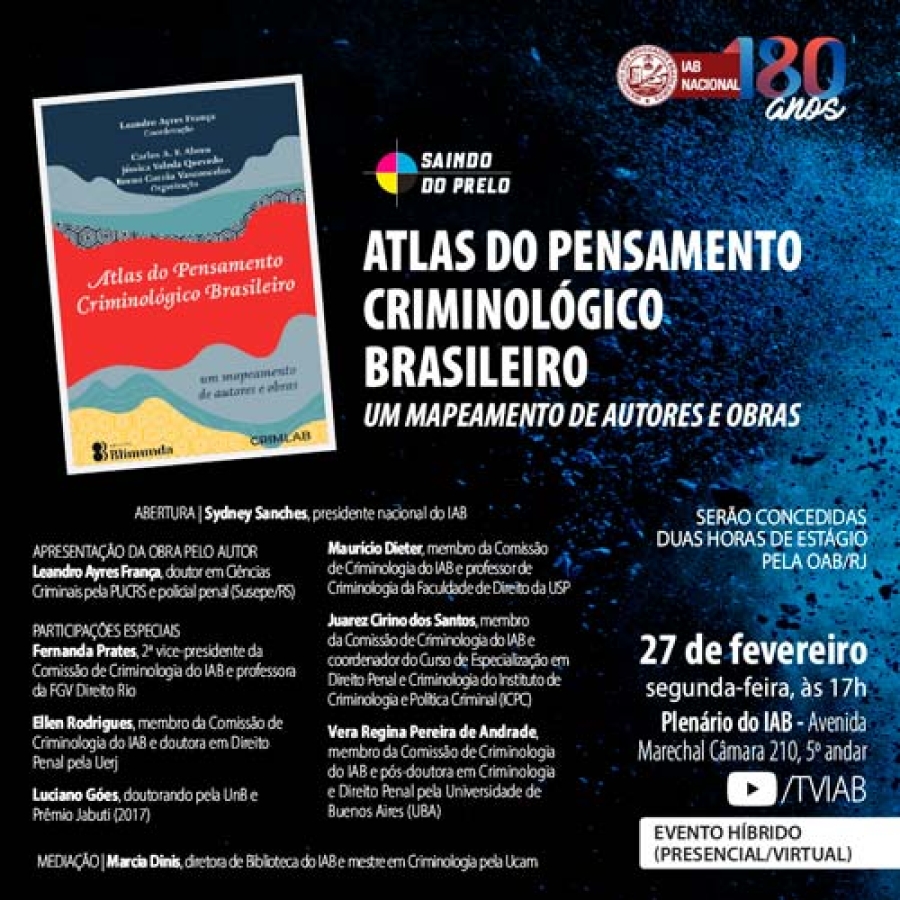 A obra será apresentada pelo coordenador do livro, o doutor em Ciências Criminais pela PUCRS e policial penal (Susepe/RS) Leandro Ayres França, com mediação da diretora de Biblioteca do IAB, Marcia Dinis. O debate sobre a publicação também terá a participação da 2ª vice-presidente da Comissão de Criminologia do Instituto, Fernanda Prates, dos membros da mesma comissão Ellen Rodrigues, Maurício Dieter, Juarez Cirino dos Santos e Vera Regina Pereira de Andrade, e do doutorando pela UnB e Prêmio Jabuti (2017) Luciano Góes. Os estudantes de Direito que assistirem ao webinar receberão duas horas de estágio pela OAB/RJ.