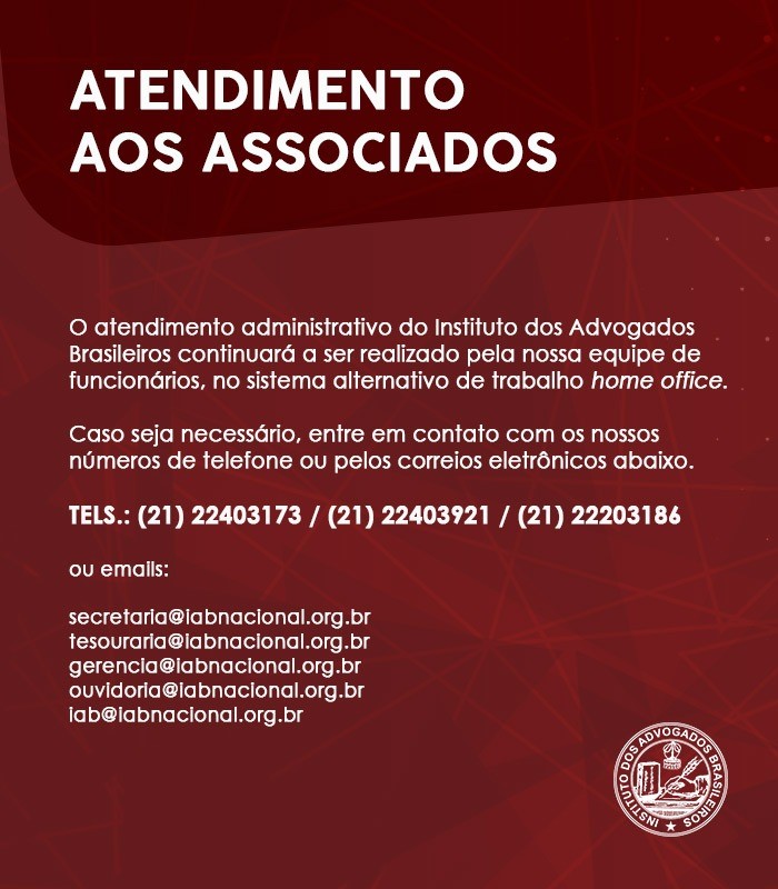 A Presidência, a Diretoria de Eventos e a Coordenação de Comissões Temáticas do Instituto dos Advogados Brasileiros, em decorrência da manutenção do isolamento social recomendado pelo Ministério da Saúde do Brasil, em razão da pandemia do novo coronavírus (Covid-19), decidem, mais uma vez, por cautela, manter a suspensão de todas as atividades presenciais programadas na sede do IAB, por tempo indeterminado, até que o estado de normalidade seja restabelecido, com o término do isolamento social determinado pelas autoridades brasileiras.