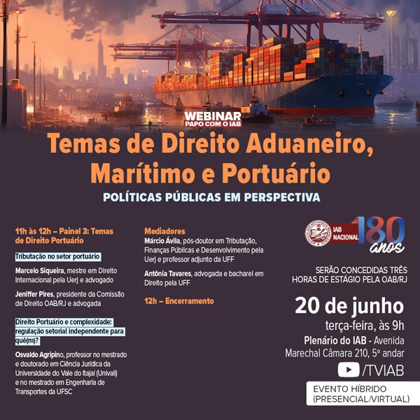 A discussão sobre a Tributação no setor portuário, que será apresentada pelo mestre em Direito Internacional pela Uerj Marcelo Siqueira e pela presidente da Comissão de Direito Aduaneiro da OAB/RJ, Jeniffer Pires, irá abrir o último painel, dedicado aos Temas de Direito Portuário. O professor no mestrado e doutorado em Ciência Jurídica da Universidade do Vale do Itajaí (Univali) Osvaldo Agripino irá apresentar a mesa intitulada Direito Portuário e complexidade: regulação setorial independente para quê(m)?.