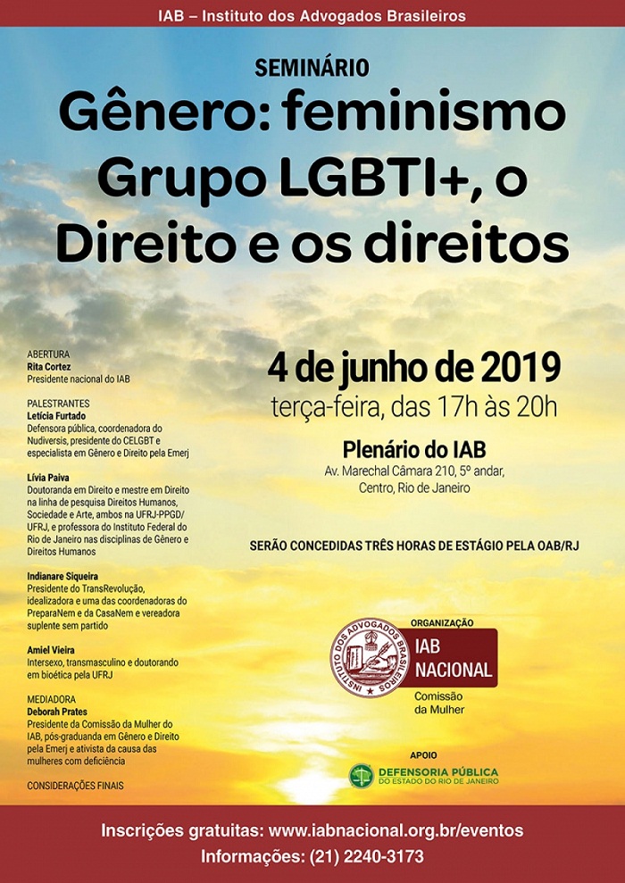 Gênero: feminismo Grupo Lgbti+, o Direito e os direitos, organizado pela Comissão da Mulher do Instituto dos Advogados Brasileiros (IAB), será realizado no dia 4 de junho, no plenário do IAB, no Centro do Rio, das 17h às 20h. O evento, que tem o apoio da Defensoria Pública do Estado do Rio de Janeiro, será aberto pela presidente nacional do IAB, Rita Cortez. As inscrições são gratuitas e podem ser feitas no site