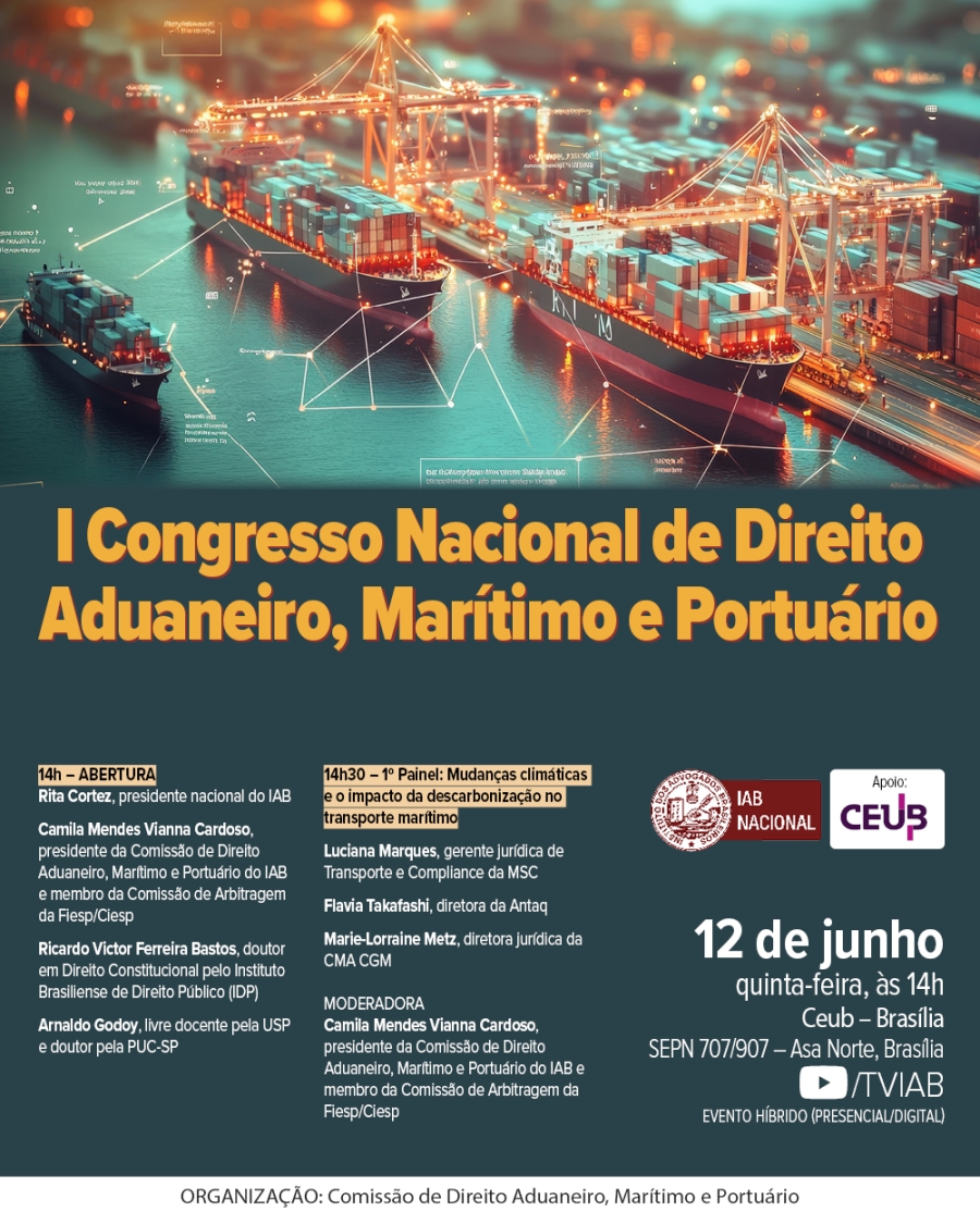 A abertura do encontro será realizada pela presidente nacional do IAB, Rita Cortez, pela presidente da Comissão de Direito Aduaneiro, Marítimo e Portuário do IAB, Camila Mendes Vianna Cardoso, pelo doutor em Direito Constitucional Ricardo Victor Ferreira Bastos e pelo livre docente pela Universidade de São Paulo (USP) Arnaldo Godoy. Durante o evento, também será promovida uma homenagem ao ministro do Superior Tribunal de Justiça (STJ) Geraldo Og Nicéas Marques Fernandes, que é ex-vice-presidente da Corte e do Conselho da Justiça Federal.