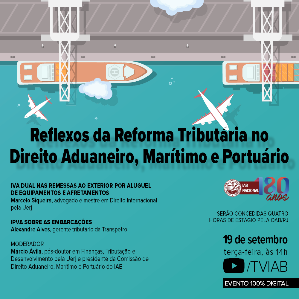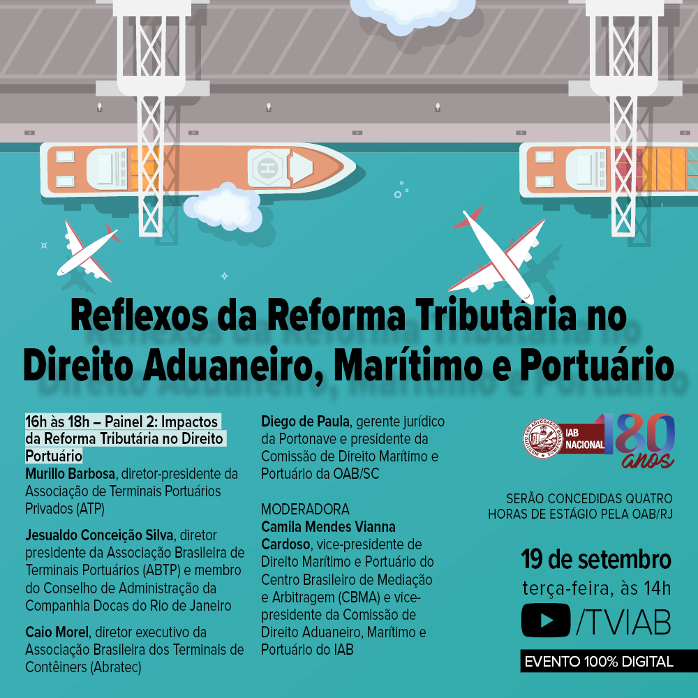 O segundo bloco do webinar, dedicado ao debate sobre os Impactos da Reforma Tributária no Direito Portuário, terá palestras do diretor presidente da Associação de Terminais Portuários Privados (ATP), Murillo Barbosa, do diretor presidente da Associação Brasileira de Terminais Portuários (ABTP), Jesualdo Conceição Silva, do diretor executivo da Associação Brasileira dos Terminais de Contêiners (Abratec), Caio Morel, e do gerente jurídico da Portonave e presidente da Comissão de Direito Marítimo e Portuário da OAB/SC, Diego de Souza. Os estudantes de Direito que assistirem ao evento receberão quatro horas de estágio pela OAB/RJ.