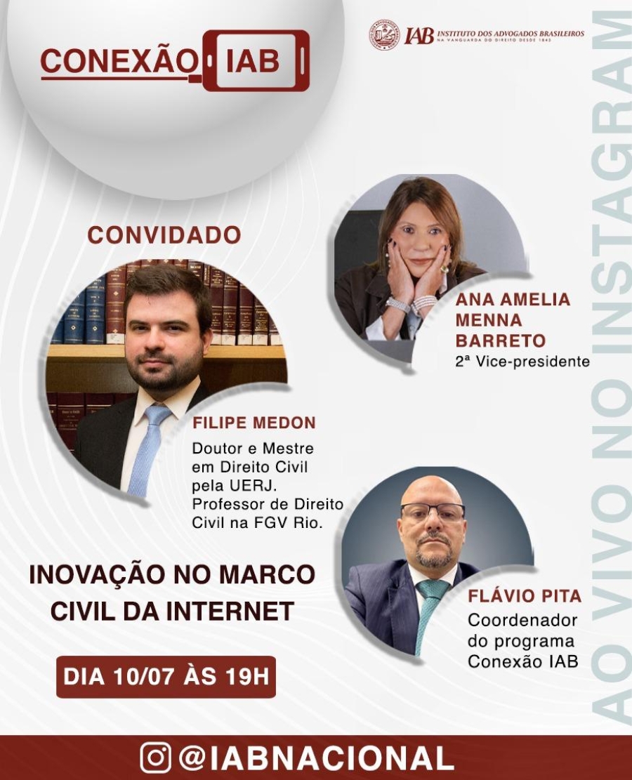 O segundo encontro do Conexão IAB, circuito de lives do Instituto dos Advogados Brasileiros, terá como tema as inovações no Marco Civil da Internet. O debate contará com especialistas no tema: o doutor e mestre em Direito Civil pela Universidade do Estado do Rio de Janeiro (Uerj) e professor de Direito Civil na FGV Rio Felipe Medon e a 2ª vice-presidente da Casa de Montezuma e presidente da Comissão de Inteligência Artificial e Inovação, Ana Amélia Menna Barreto. A live será transmitida pelo canal da entidade no Instagram (@iabnacional) na próxima quinta-feira (10/7), às 19h, e contará com condução do coordenador do projeto, Flávio Pita.