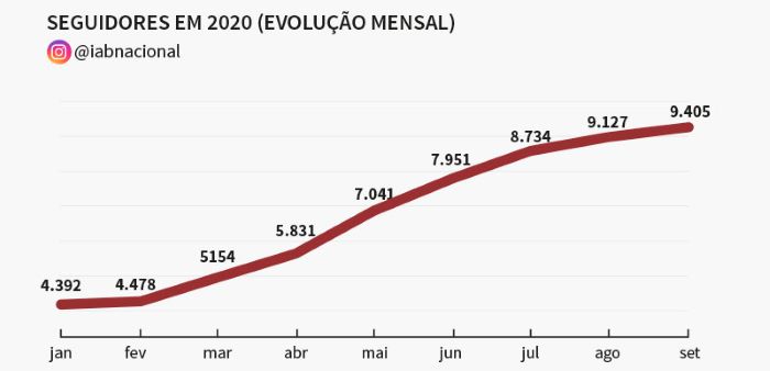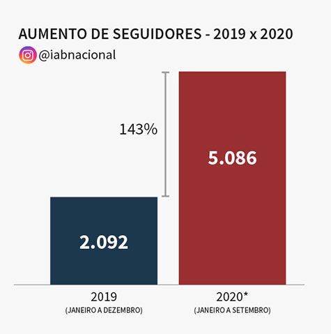 Produtividade – A pandemia não parou a produtividade do IAB, que se refletiu também na quantidade de posts feitos para as redes. Mesmo com o Instagram em destaque, a página do IAB no Facebook continuou crescendo. Em 2020, o total de seguidores chegou a 64.615 no final de setembro. São 4.431 seguidores a mais somente neste ano, um aumento médio de quase 500 por mês.