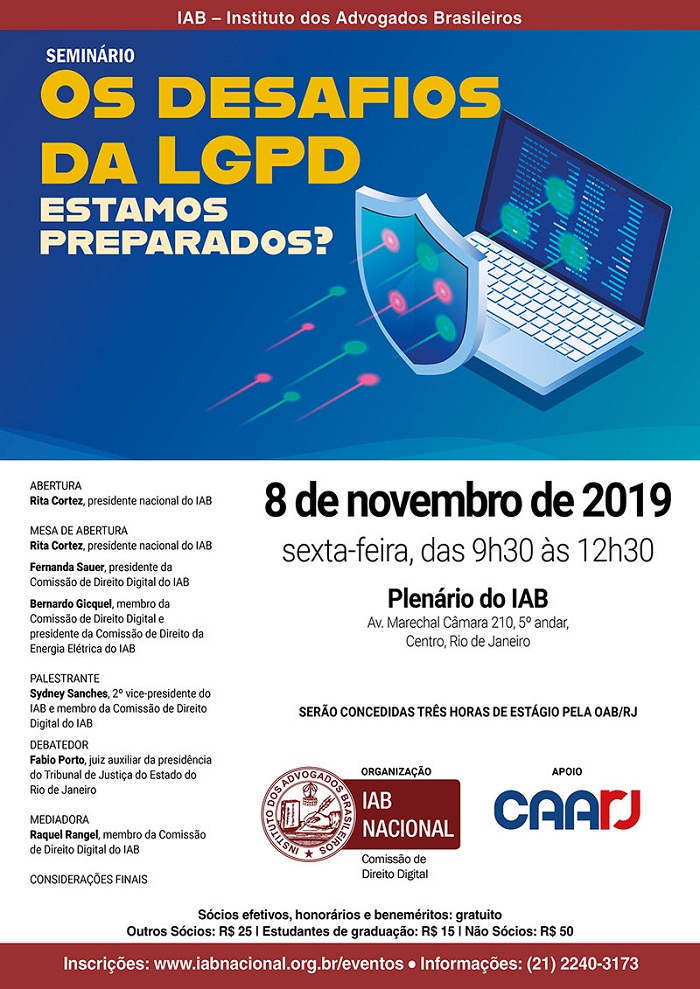O juiz Fábio Porto, auxiliar da Presidência do Tribunal de Justiça do Estado do Rio de Janeiro (TJRJ), será o debatedor do tema da palestra que o 2º vice-presidente do Instituto dos Advogados Brasileiros (IAB), Sydney Sanches, fará no dia 8 de novembro, no plenário do IAB, no Centro do Rio, no seminário sobre Os desafios da LGPD - estamos preparados?. Organizado pela Comissão de Direito Digital do IAB, o evento discutirá, das 9h30 às 12h30, os efeitos da entrada em vigor, em 2020, da Lei Geral de Proteção de Dados (LGPD).