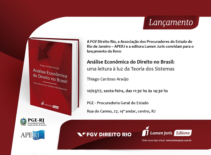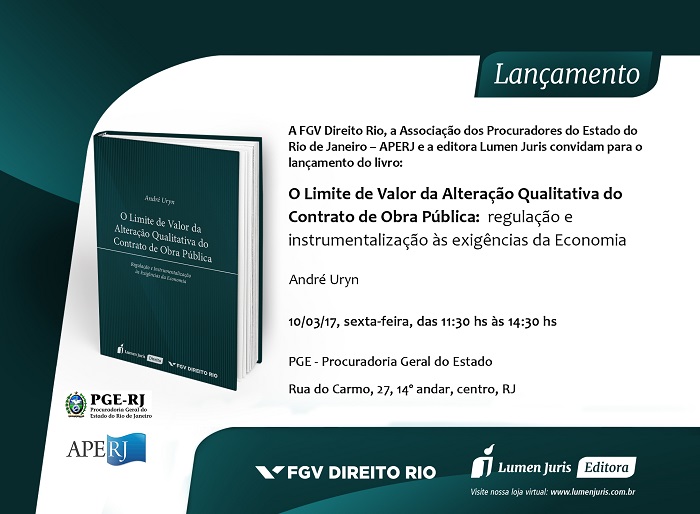 Os lançamentos dos livros de André Uryn e Thiago Cardoso Araújo são uma iniciativa da FGV Direito Rio, da Associação dos Procuradores do Estado do Rio de Janeiro (Aperj) e da Editora Lumem Juris. A PGE/RJ está situada na Rua do Carmo nº 27, 14º andar, no Centro.