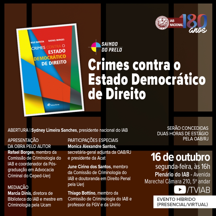 Com mediação da diretora de Biblioteca do IAB, Marcia Dinis, o lançamento também contará com as participações da secretária-geral adjunta da OAB/RJ, Monica Alexandre Santos e dos membros da Comissão de Criminologia do Instituto June Cirino dos Santos e Thiago Bottino. Os estudantes de Direito que assistirem ao evento receberão duas horas de estágio pela OAB/RJ.