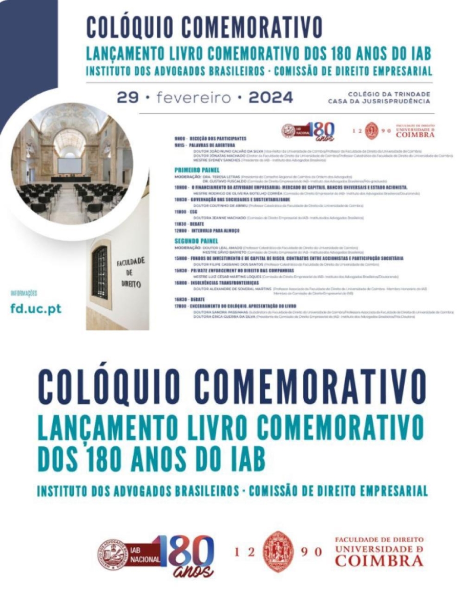 Os painéis serão moderados pelo secretário e pelo membro da Comissão de Direito Empresarial do IAB, Gustavo Fuscaldo e Sávio Barreto, respectivamente, pela presidente do Conselho Regional de Coimbra da Ordem dos Advogados, Teresa Letras, e pelo professor catedrático da Faculdade de Direito da Universidade de Coimbra Leal Amado. No encerramento do colóquio, a presidente da Comissão de Direito Empresarial do IAB, Érica Guerra, e a subdiretora da Faculdade de Direito da Universidade de Coimbra, Sandra Passinhas, farão a apresentação do livro produzido pelos membros do Instituto.