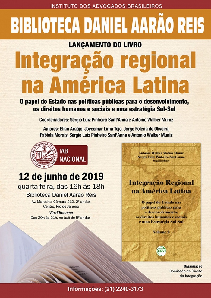 O livro Integração regional na América Latina – o papel do Estado nas políticas públicas para o desenvolvimento, os direitos humanos e sociais e uma estratégia Sul-Sul (Editora CRV) será lançado no dia 12 de junho, das 16h às 18h, na Biblioteca Daniel Aarão Reis, do Instituto dos Advogados Brasileiros (IAB), no Centro do Rio. Organizada pelo vice-presidente da Comissão de Direito da Integração do IAB, Sérgio Luiz Pinheiro Sant’Anna, e o membro da comissão Antonio Walber Matias Muniz, a obra reúne seis textos.