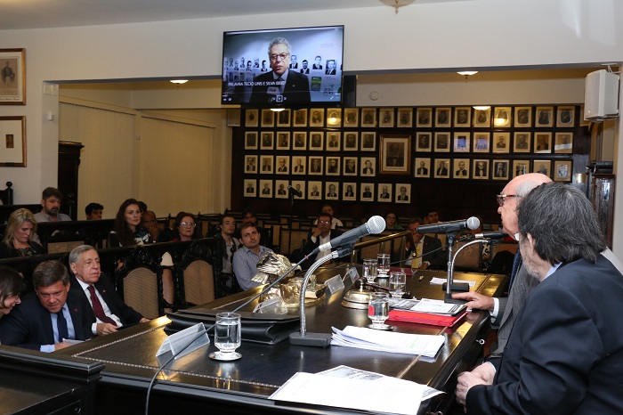 A mensagem de boas-vindas de Técio Lins e Silva é projetada nos telões do plenário