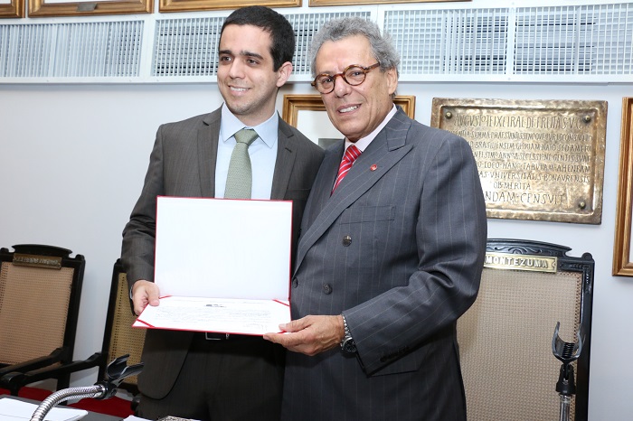Guilherme Chambarelli Neno recebe o certificado de consócio do IAB das mãos de Técio Lins e Silva