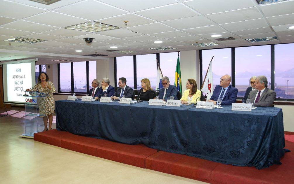 Da esq. para a dir., Luciana Boiteux, Luiz Felipe Conde, Vladimir Saboia, Fábio Nogueira, Ana tereza Basilio, Rogério Schietti, Marcia Dinis, Harisson Almeida e Geraldo Nogueira. Divulgação: OAB/RJ/Flávia Freitas