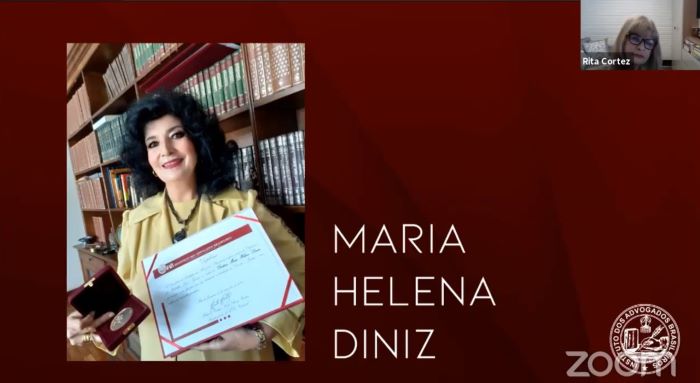 Por meio de mensagem gravada em vídeo e transmitida na Sessão Plenária Solene, a jurista se disse muito grata com a homenagem: “Agradeço por essa generosidade, que muito me honra e comove”. Maria Helena Diniz citou o IAB como “referência da cultura jurídica nacional e defensor dos direitos humanos e do estado democrático de direito”.
