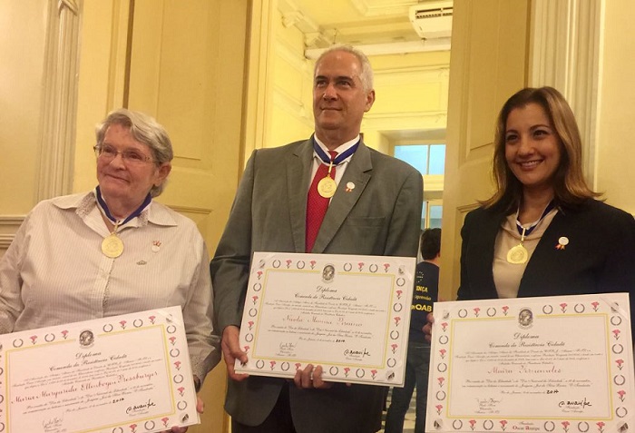 Da esq. para a dir., Margarida Pressburger, Nicola Piraino e Maíra FernandesA Comenda da Resistência Cidadã, em defesa do aprimoramento do direito, da cultura e das liberdades democráticas, homenageia personalidades e entidades de destaque na vida nacional e internacional e é resultado de uma parceria da Associação de Antigos Alunos e Amigos da Faculdade Nacional de Direito (Alumni/FND) e da Fundação Oscar Araripe. Este foi o terceiro ano consecutivo que a Alumni selecionou nomes para serem homenageados, entre juristas, professores, jornalistas, escritores, lideranças em causas sociais e ex-funcionários da faculdade.