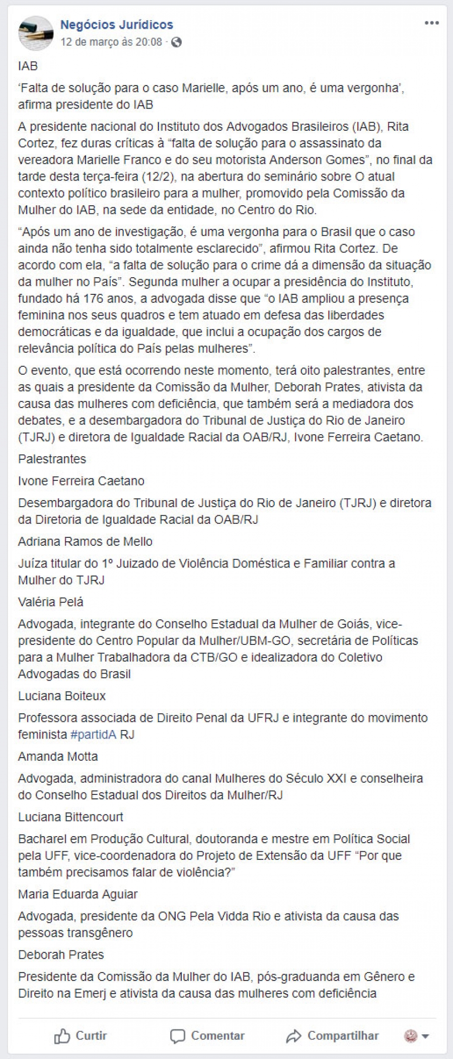 ‘Falta de solução para o caso Marielle, após um ano, é uma vergonha’, afirma presidente do IAB