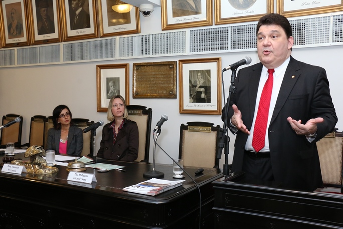Juliana Medrado Tângari e Mônica Werneck acompanham a exposição de Roberto Grassi Neto da tribuna