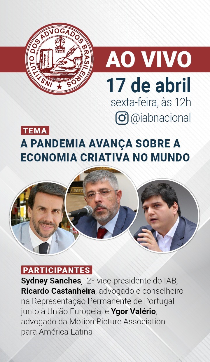 O 2º vice-presidente do Instituto dos Advogados Brasileiros (IAB), Sydney Sanches, receberá dois convidados para uma conversa no Instagram, nesta sexta-feira (17/4), às 12h, sobre o tema “A pandemia avança sobre a economia criativa no mundo”. A live acontecerá no perfil @iabnacional, com a participação dos advogados Ricardo Castanheira, conselheiro na Representação Permanente de Portugal junto à União Europeia, e Ygor Valério, da Motion Picture Association para a América Latina.