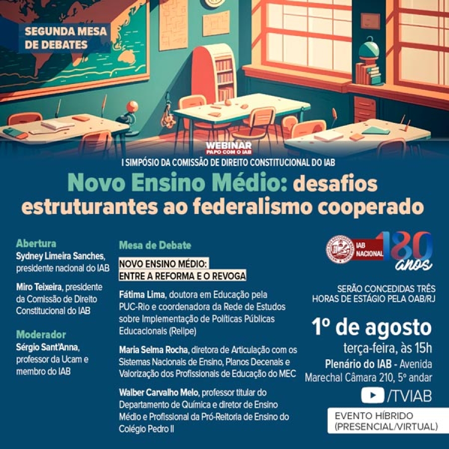 A mesa de debate intitulada Novo Ensino Médio: entre a reforma e o revoga terá como palestrantes a coordenadora da Rede de Estudos sobre Implementação de Políticas Públicas Educacionais (Reiipe), Fátima Lima, a diretora de Articulação com os Sistemas Nacionais de Ensino, Planos Decenais e Valorização dos Profissionais de Educação do MEC, Maria Selma Rocha, e o professor titular do Departamento de Química e diretor de Ensino Médio e Profissional da Pró-Reitoria de Ensino do Colégio Pedro II, Walber Carvalho Melo. O professor da Ucam e membro do IAB Sérgio Sant’Anna fará a mediação dos trabalhos. Os alunos de Direito que assistirem ao webinar receberão três horas de estágio pela OAB/RJ.
