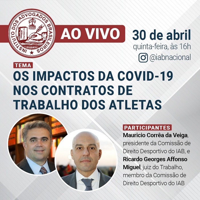Em tempos de redução de salários e da jornada de trabalho, como ficam os contratos dos jogadores de futebol, postos em isolamento social, com a suspensão dos campeonatos e a consequente queda na arrecadação dos clubes? Essa questão é uma das que serão discutidas na live no Instagram sobre ‘Os impactos da Covid-19 nos contratos de trabalho dos atletas’, nesta quinta-feira (30/4), às 16h, no perfil @iabnacional. A conversa será entre o presidente da Comissão de Direito Esportivo do Instituto dos Advogados Brasileiros (IAB), Maurício Corrêa da Veiga, e o juiz Ricardo Georges Affonso Miguel, membro da comissão.
