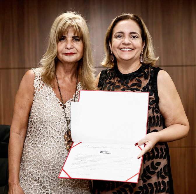 Rita Cortez, com a placa que recebeu do IAC, e João Gonçalves de Lemos, com a Medalha Luiz GamaNa mesma sessão, João Gonçalves de Lemos deu posse a quatro novas sócias do Instituto dos Advogados do Ceará: Cynara Mariano, Raquel Machado, Darlene Braga e Ana Vladia Feitosa, que é vice-presidente da OAB/CE.