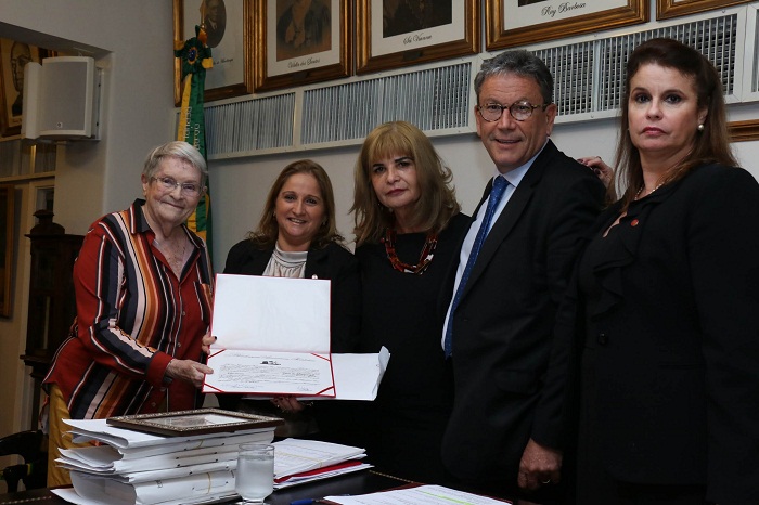 Em seu discurso de posse, Tânia de Albuquerque disse também que “o IAB, onde princípios republicanos fizeram morada, é o guardião do nosso futuro e da nossa sobrevivência, enquanto nação”. Ao saudá-la, Pressburger falou: “Tânia não foi minha amiga de infância, mas é minha amiga de militância em muitas lutas”. Da esq. para a dir., Margarida Pressburger, Tânia de Albuquerque, Rita Cortez, Antonio Laért Vieira Junior e Adriana Brasil Guimarães