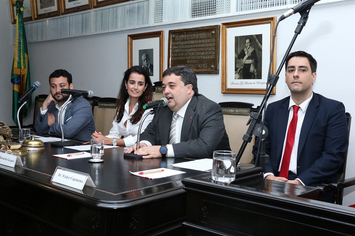 Da esq. para a dir., Bruno Feigelson, Fernanda Sauer, Bernardo Gicquel e Walter CapanemaContratos inteligentes – Coordenador técnico do Departamento de Informática da PUC Rio, Rafael Nasser foi o primeiro a falar no painel sobre Impactos de blockchain na área jurídica, moderado por Raquel Rangel, membro da Comissão de Direito Digital. Segundo Rafael Nasser, “o Direito está impactado pelas avançadas tecnologias, cada vez mais aplicadas, por exemplo, na gestão dos escritórios e no acompanhamento dos processos”. Ele defendeu que “os contratos inteligentes dão maior garantia ao cumprimento de cláusulas e inibem eventuais violações do acordado”.