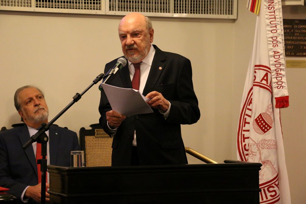 Em 44 anos de vida associativa, José Ribas Vieira contribuiu muito com trabalhos do IAB, chegando a ser presidente da Comissão de Direito Constitucional. Tostes destacou a qualidade das produções acadêmicas de Vieira, que é professor aposentado das universidades Federal do Rio de Janeiro (UFRJ) e Federal Fluminense (UFF). “São discussões muito atuais e contemporâneas que o professor Ribas aborda nas suas obras com a peculiaridade do seu grau de conhecimento”, afirmou o orador. Também professor, Jorge Alex Nunes Athias atuou como docente adjunto da Universidade Federal do Pará (UFPA). “Sempre primou por transmitir o seu amplo conhecimento jurídico nas disciplinas de Direito Ambiental, Direito Mineral e Recursos Hídricos”, elogiou Tostes, que ressaltou ainda outras atividades do consócio no seu estado natal, onde foi procurador-geral e presidente do Instituto dos Advogados do Pará (IAP).