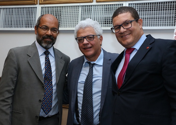 Os presidentes das comissões de Direito Administrativo, Manoel Messias Peixinho, e Direito Constitucional, Sérgio Sant’Anna, trouxeram Rogério Monte Santo para o IAB. “Foi meu aluno de Direito Constitucional e se junta às novas mentes que ingressam no Instituto”, afirmou Sant’Anna, ao saudá-lo. De acordo com Peixinho, “é muito bom ver jovens advogados tomando posse e renovando os quadros do Instituto”. Da esq. para a dir., Sérgio Sant’Anna, Manoel Messias Peixinho e Rogério Monte Santo