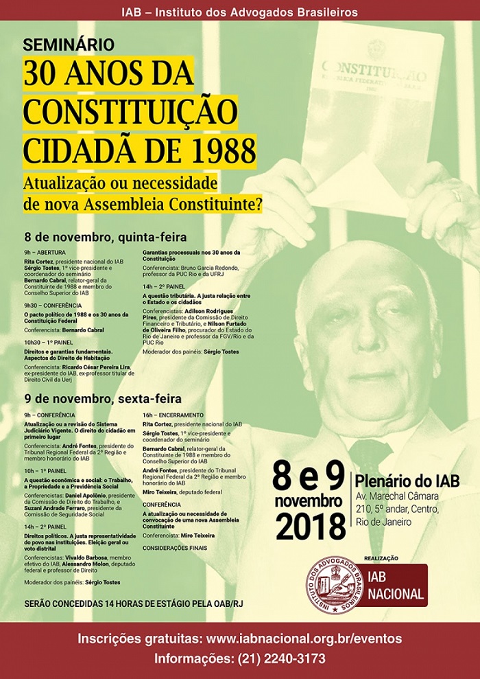 Além de debater se a Carta Magna, que recebeu 103 emendas nos últimos 30 anos, deve ser reformada ou realizada uma nova Assembleia Nacional Constituinte, os palestrantes tratarão de temas como previdência social, voto distrital, revisão do sistema judiciário, garantias processuais e a relação entre o Estado e os cidadãos. Farão palestras o presidente do Tribunal Regional Federal da 2ª Região (TRF2), desembargador André Fontes; o procurador do Estado do Rio de Janeiro Nilson Furtado de Oliveira Filho; o ex-professor titular de Direito Civil da Uerj e ex-presidente do IAB Ricardo César Pereira Lira; o ex-deputado constituinte Vivaldo Barbosa e os deputados federais Miro Teixeira (Rede-RJ), que também atuou na Assembleia Nacional Constituinte de 1987, e Alessandro Molon (PSB-RJ), entre outros.