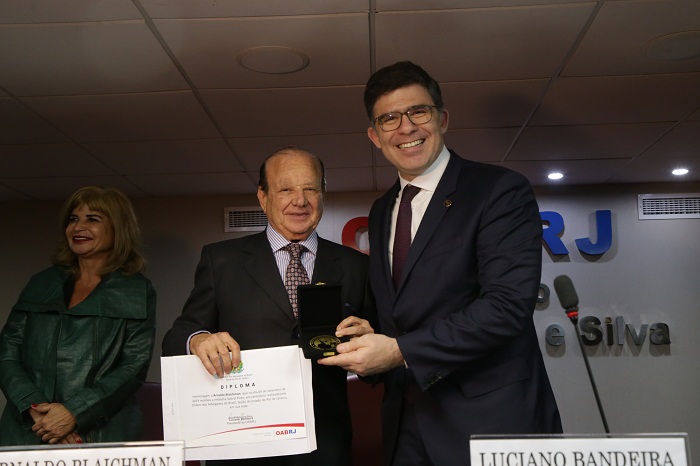 “A Medalha Sobral Pinto é uma homenagem à advocacia, aos profissionais que, ao longo de 50 anos de profissão, enalteceram e orgulharam a advocacia do Estado do Rio de Janeiro e do País”, afirmou Luciano Bandeira. Ao receber a comenda, Arnaldo Blaichman disse: “O advogado só é advogado quando tem coragem de se opor aos poderosos de todo gênero”. Rita Cortez, Arnaldo Blaichman e Luciano Bandeira
