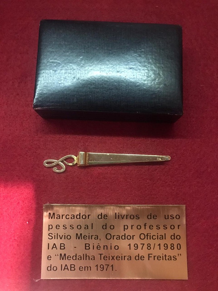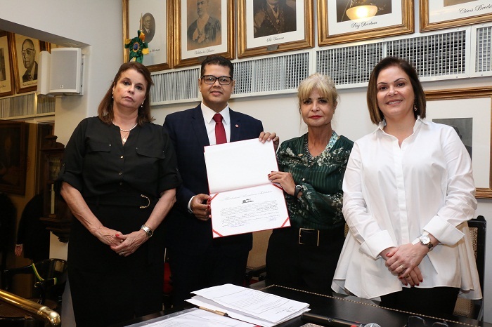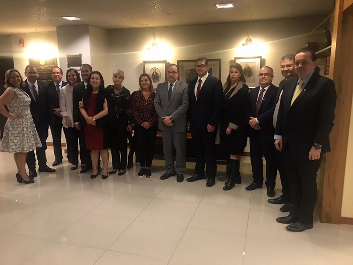 No encontro, Rita Cortez empossou Auriney Uchôa de Brito como membro efetivo e representante institucional no Estado do Amapá. O encontro foi marcado, ainda, pela doação feita pelo presidente do Instituto Silvio Meira (ISM) e representante institucional do IAB no Pará, André Augusto Malcher Meira. Rita Cortez entronizou no Museu do IAB o marcador de página, em ouro e com a inicial S, que pertenceu ao jurista, consócio e orador oficial do IAB Silvio Meira. Em 1971, o jurista foi agraciado com a Medalha Teixeira de Freitas, principal comenda do IAB. Da esq. para a dir., Adriana Brasil Guimarães, Auriney Uchôa de Brito, Rita Cortez e Leila Pose Sanches Todos os participantes do encontro reunidos na Biblioteca Daniel Aarão Reis