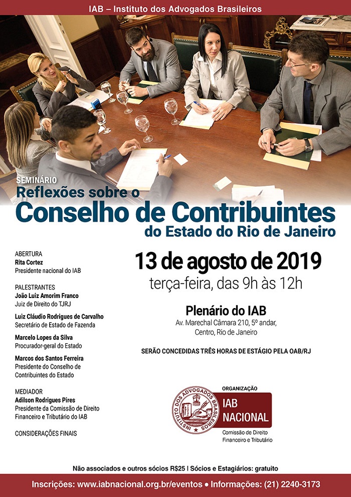Reflexões sobre o Conselho de Contribuintes do Estado do Rio de Janeiro, que será realizado pela Comissão de Direito Financeiro e Tributário do Instituto dos Advogados Brasileiros (IAB), na próxima terça-feira (13/8), das 9h às 12h, no plenário do IAB, no Centro do Rio. As inscrições para o evento, que será aberto pela presidente nacional do IAB, Rita Cortez, podem ser feitas no site