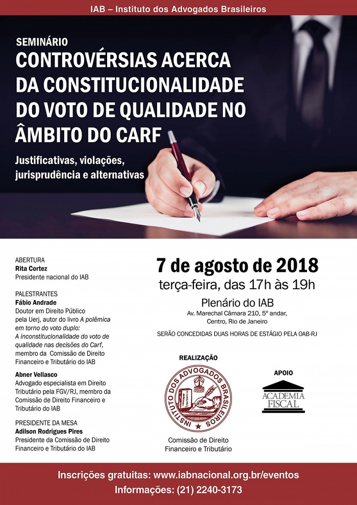 Antes da realização do seminário, haverá o lançamento, às 15h, na Biblioteca Daniel Aarão Reis, do IAB, do livro A polêmica em torno do voto duplo – a inconstitucionalidade do voto de qualidade nas decisões do Carf (Editora Lumen Juris), de autoria de Fábio Martins de Andrade.